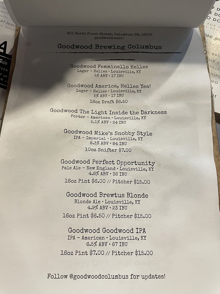 Goodwood Brewing is a vibrant brewpub located in Columbus, OH, offering a range of delectable dishes and craft beers. Visitors praise the flavorful Goodwood burger and the savory beer cheese mac and cheese as standout items on the menu. The Buffalo chicken wrap and kale salad also receive glowing reviews for their taste and reasonable pricing. The atmosphere at Goodwood is described as welcoming, with friendly staff and a variety of seating options, including outdoor and covered seating. Customers appreciate the attentive service, diverse drink options, and fun Beer Flight experience. The restaurant's convenient location near Nationwide Arena makes it a popular choice for pre-event dining. Goodwood Brewing stands out for its diverse menu, flavorful dishes, and inviting ambiance, making it a must-visit spot in the Arena District.